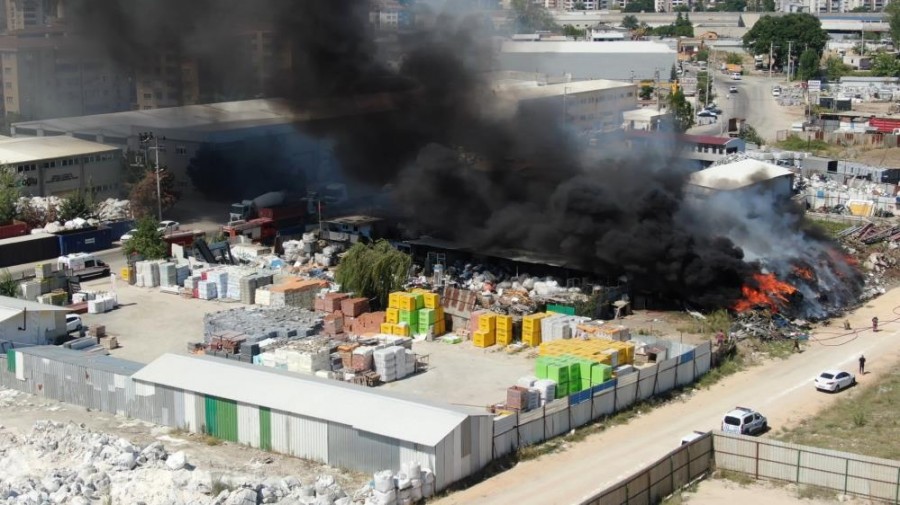 Bursa'da geri dönüşüm tesisinde meydana gelen yangın paniğe neden olurken, itfaiye ekiplerinin hızlı müdahalesiyle söndürüldü. Yangın anları dronla havadan görüntülendi.