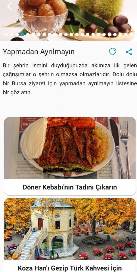 Bursa kent merkezi ve ilçelerindeki kültür ve turizm unsurlarını hedef alan uygulamanın içerikleri Turizm ve Tanıtma Şube Müdürlüğü tarafından hazırlandı. Uygulama kapsamında tanıtım yazıları, sanal turlar, tanıtım videoları, gezi rotaları ve özgün fotoğraflardan oluşan binin üzerinde özgün içerik bulunuyor. Uygulama içerisinde 22 farklı kategorideki 543 farklı mekan 3963 farklı fotoğraf ile tanıtılırken 141 farklı noktadan oluşan 14 adet gezi rotası yer alıyor, uygulama ve içerikler 2 dilde servis ediliyor.