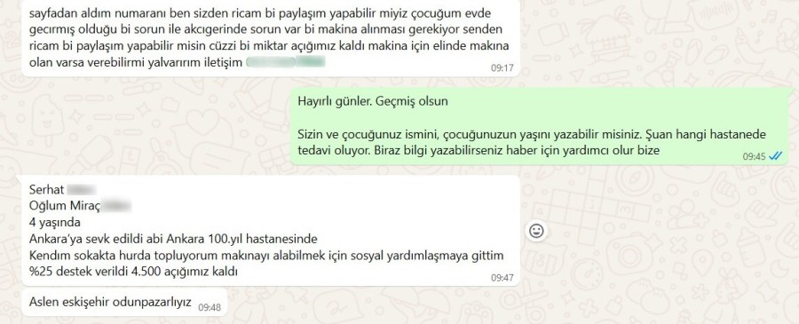 Edinilen bilgilere göre; kendisini S.B. olarak tanıtan şahıs, Eskişehir'de yerel medyada görev yapan bir basın mensubuna ulaşım sağladı. Bir mesajlaşma uygulaması üzerinden basın mensubuyla görüşen şahıs; M.B. isimli 4 yaşındaki çocuğunun geçirdiği ev kazası nedeniyle akciğer rahatsızlığı yaşadığını ve Ankara 100. Yıl Hastanesi'nde tedavi gördüğünü söyledi. Odunpazarılı olduklarını, kendisinin hurdacılık yaptığını ve 4 bin 500 TL açıkları kaldığını ifade eden şahıs, basın mensubunun destek amacıyla paylaşım yapmasını istedi.