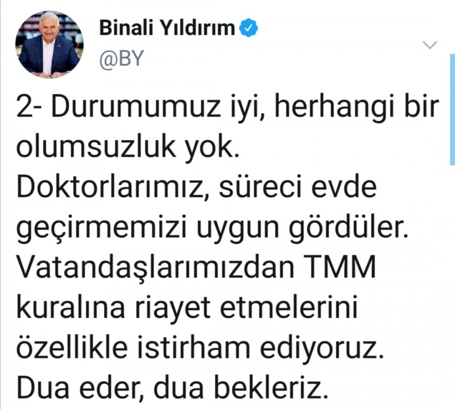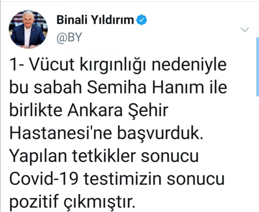 Binali Yıldırım'ın testi pozitif çıktı. Sağlık Bakanı Fahrettin Koca Binali Yıldırım ve eşini hastaneden evine uğurladı. Belki o da testin pozitif çıkacağını bilmiyordu. Şu açıklamayı yaptı: Binali Yıldırım Bey ve kıymetli eşi Semiha Hanım'ın Ankara Şehir Hastanemizde yapılan tetkiklerinde COVID-19 testleri pozitif çıkmıştır. Şu an için durumları iyi ve kendilerini evde tedavileri için hastanemizden uğurladık. Gücümüz tedbir almaya ve sevdiklerimizi korumaya yeter."