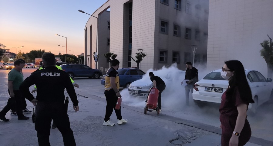 Olay, saat 20.30 sıralarında İnegöl Devlet Hastanesi Acil Servis otoparkında meydana geldi. Park halindeki 16 AHS 595 plakalı otomobil aniden alev aldı. O sırada Acil Servis'te bulunan İnegöl Emniyet Müdürlüğü Trafik Büro Amirliği ekipleri ve ambulans görevlileri, yangın tüpleri ile yanan araca müdahale ettiler.