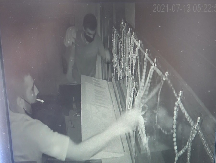Olay anı ise iş yerinin güvenlik kameralarına anbean yansıdı. Görüntülerde, iki kişinin ilk olarak dükkan kapısının önüne gelerek kilidi kırdıktan sonra kaçtıkları, daha sonra geri dönerek kapıyı açıp girdikleri görüldü. Diğer açıdan ise, vitrinde ve camda asılı olan gümüş aksesuar ve eşyaları alarak hızla kaçtıkları görüldü.