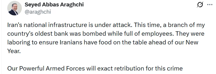 İran Dışişleri Bakanı Abbas Arakçi, çalışanlarla dolu bir banka şubesinin bombalandığını açıkladı. Arakçi, saldırıya İran'ın güçlü silahlı kuvvetlerinin karşılık vereceğini söyledi.