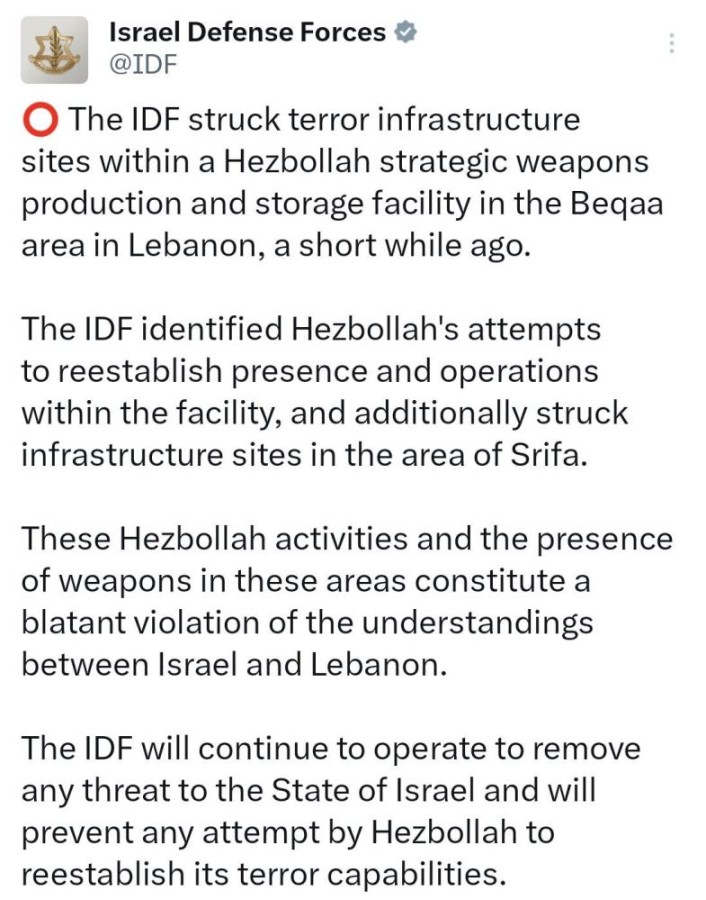 Orta Doğu'daki katliamlarını sürdüren İsrail, bir kez daha Lübnan'ı hedef aldı. İsrail Savunma Kuvvetleri'nden (IDF) yapılan açıklamada, Lübnan'ın Bekaa bölgesinde bulunan Hizbullah'a ait silah üretim ve depolama tesislerine saldırı düzenlendiği bildirildi. Ayrıca Lübnan'ın güneyindeki Srifa bölgesinde bulunan altyapı tesislerinin hedef alındığı aktarıldı. Hizbullah'ın söz konusu tesislerde yeniden varlık gösterme girişiminde bulunduğu belirtilen açıklamada, bu girişimlerin İsrail ile Lübnan arasında varılan mutabakatların ihlali anlamına geldiği savunuldu. Açıklamada, "IDF, İsrail'e yönelik her türlü tehdidi ortadan kaldırmak için operasyonlarına devam edecek. Hizbullah'ın terör kapasitesini yeniden kazanmasına yönelik her türlü girişimini engelleyeceğiz" denildi.