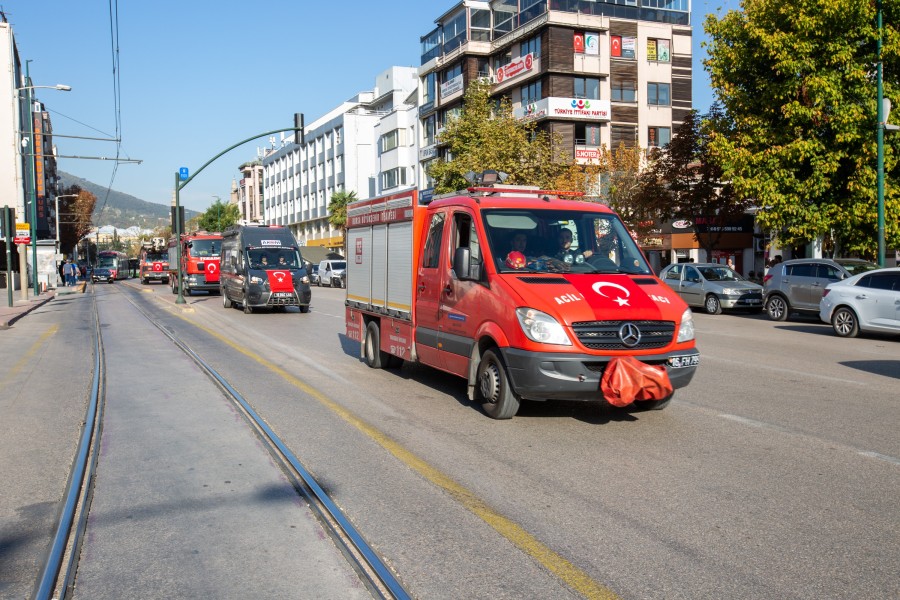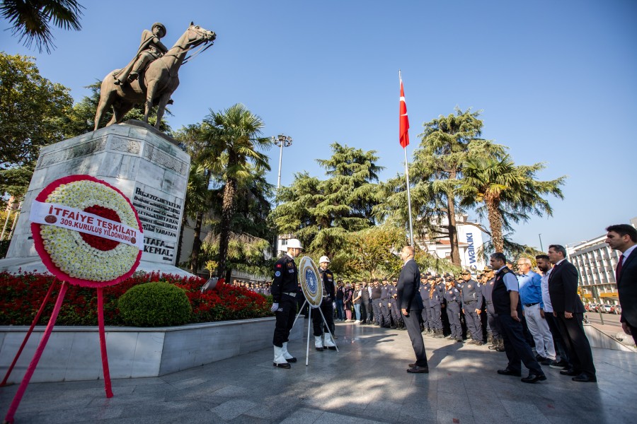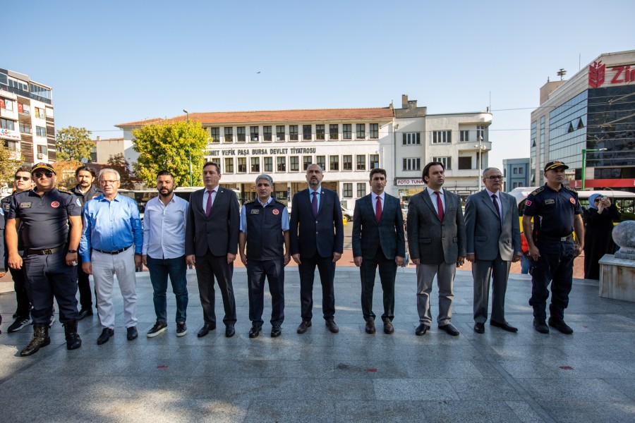 Bursa Büyükşehir Belediyesi İtfaiye Daire Başkanlığı tarafından düzenlenen törenler, Atatürk Anıtı'na çelenk sunulması ile başladı. Büyükşehir Belediyesi Başkanvekili Ali Mersin ve itfaiye erleri, Atatürk Anıtı'na çelenk sundu. Çelenk sunumunun ardından saygı duruşunda bulunuldu ve Büyükşehir Belediyesi Bandosu eşliğinde İstiklal Marşı okundu.