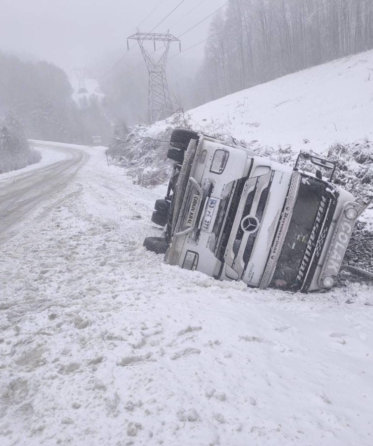 Bursa'nın İnegöl ilçesinde kar yağışı sebebiyle kayarak yoldan çıkan tır devrildi. Kazada 2 kişi yaralandı.