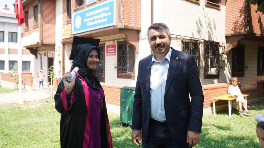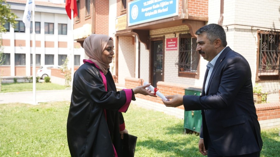 Yıldırım Belediye Başkanı Oktay Yılmaz, Karapınar Kadın Eğitim ve Girişimcilik Merkezi'nde giyim üretim teknolojileri alanında eğitimini başarı ile tamamlayarak mezun olan kadınların mutluluğunu paylaştı.