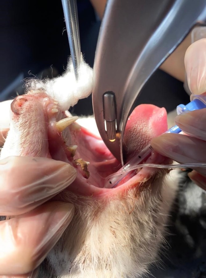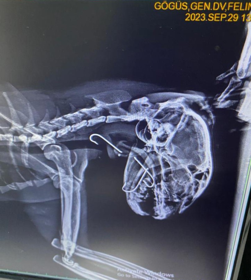 Veteriner hekime getirilen sokak kedisinin röntgeninde boğazına saplanmış üç tane olta kancası olduğu tespit edildi. Ameliyata alınan kedinin boğazındaki kancalar çıkartıldı. Yaklaşık bir saat süren ameliyatta kancaların derine saplandığı görüldü. Ameliyattan sonra kedi sağlığına kavuşurken veteriner hekim Furkan Alkan, süreci şöyle aktardı: