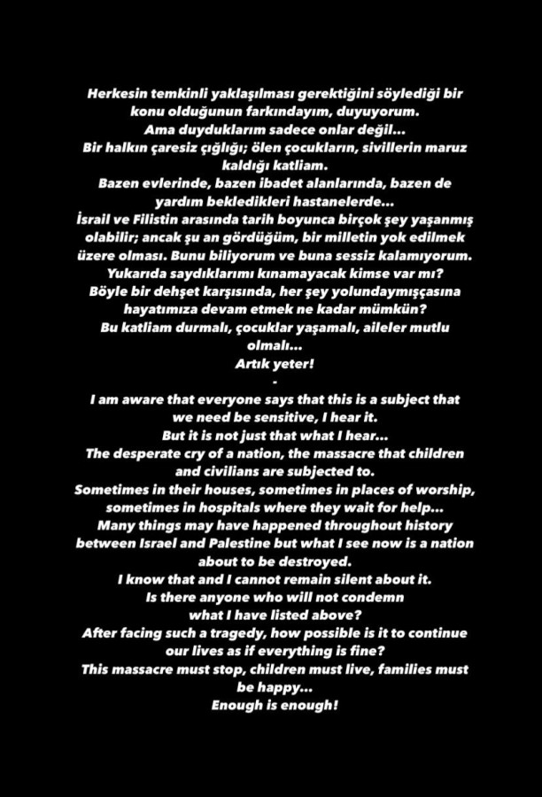 Portekiz ekibi Benfica'da forma giyen milli futbolcu Kerem Aktürkoğlu, İsrail'in Filistin'e saldırılarına sessiz kalamadığını belirterek, "Böyle bir dehşet karşısında her şey yolundaymışçasına hayatımıza devam etmek ne kadar mümkün? Bu katliam durmalı, çocuklar yaşamalı, aileler mutlu olmalı. Artık yeter" dedi.