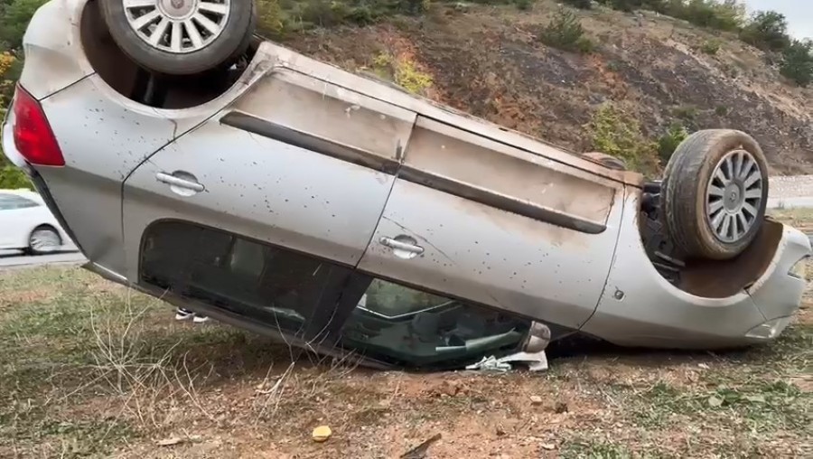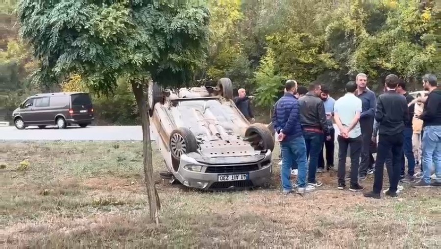 Yağışlı havanın etkisiyle savrulan araç, orta refüje çarpıp takla attı.