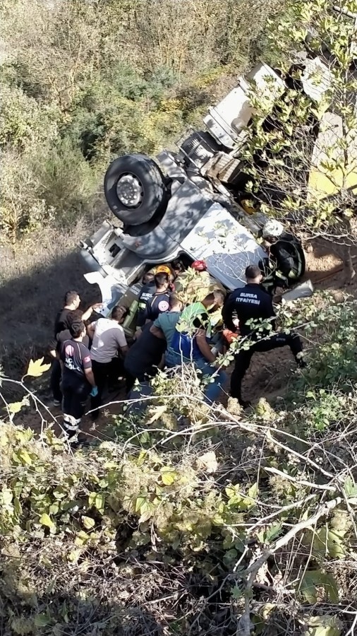 Bursa'da kontrolden çıkan kamyon virajı almayıp dere yatağına uçtu. Kazada sıkışan sürücü ambulansla hastaneye kaldırılırken, olayla ilgili tahkikat başlatıldı.