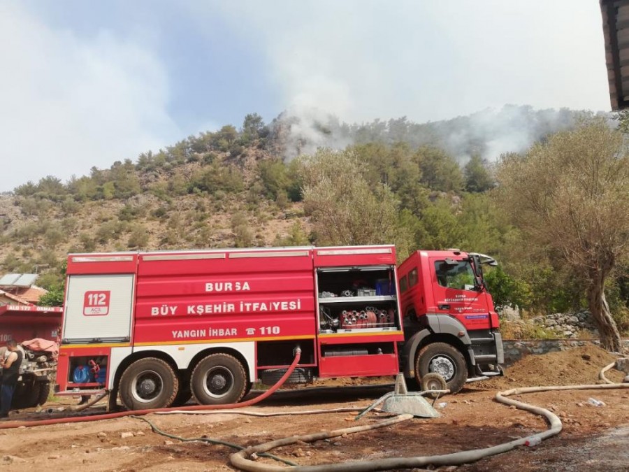 Antalya'nın Manavgat ilçesinde 28 Temmuz'da başlayan ve ardından 30 farklı ilde çıkan yangınlara müdahale devam ediyor. 6 kişinin hayatını kaybettiği, binlerce hayvanın telef olduğu, orman ve tarım arazileri ile sera alanlarının küle döndüğü yangınlarla mücadele seferberliğine 7 araç ve 21 personelle katılan Bursa Büyükşehir Belediyesi ekipleri, Muğla'nın Marmaris İlçesi'ne bağlı Orhaniye ve Yukarı Keçibükü Mahallelerinde alevlerle savaşıyor. Aynı bölgedeki Azerbaycan Ordu İtfaiyesi ile işbirliği içinde çalışan Bursa ekibi, alevlerle mücadelenin yanı sıra yangından kurtulmayı başaran hayvanlara da kucak açıyor. Alevlerden kaçan iki kaplumbağa Bursa ekibi tarafından sulandıktan sonra emniyetli bölgeye taşındı.