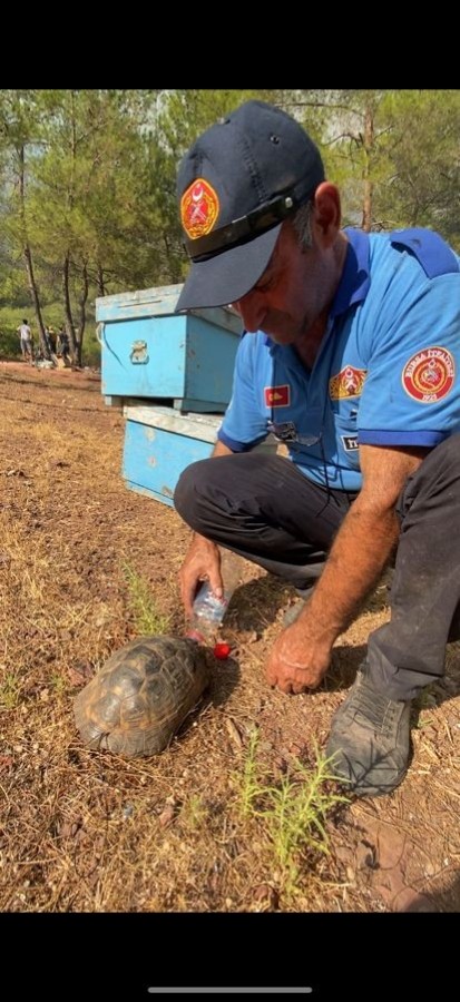 Marmaris'teki yangınlara müdahale için giden Bursa Büyükşehir Belediyesi itfaiye ekipleri, çalışmalarıyla takdir topluyor. Bursa ekibi, alevlerle mücadelenin yanında felâketten kurtulmayı başaran kaplumbağaları da sulayıp, güvenli alanlara taşıyor.