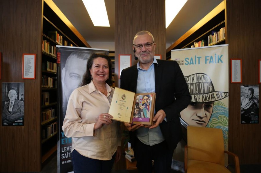 Söyleşiye katılan öğrencilere de Nilüfer Belediyesi Kütüphaneleri tarafından Sait Faik Abasıyanık'ın Seçme Hikayeler kitabı hediye edildi.