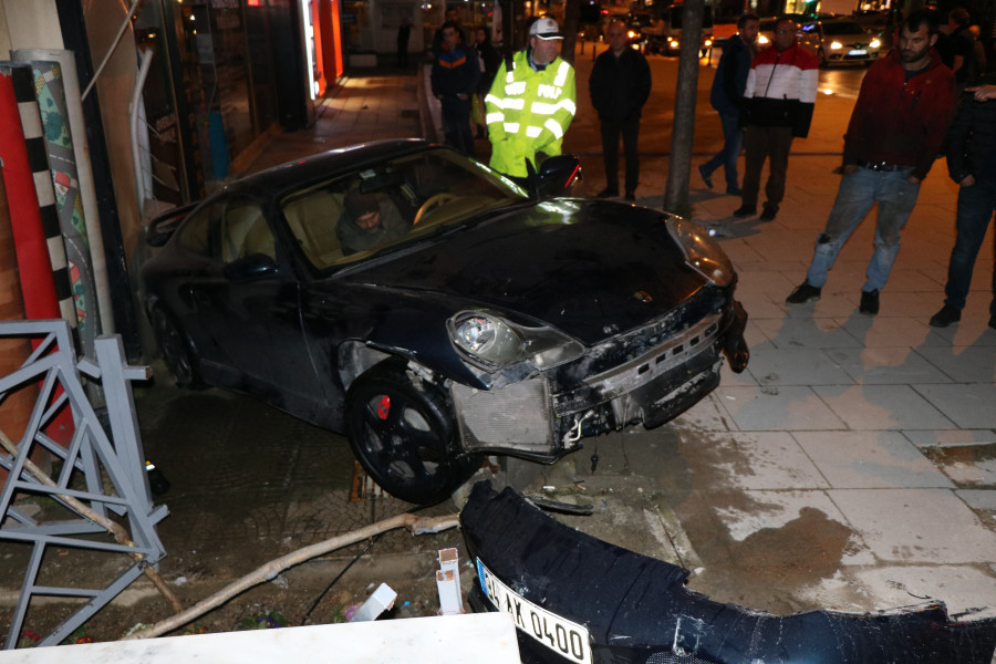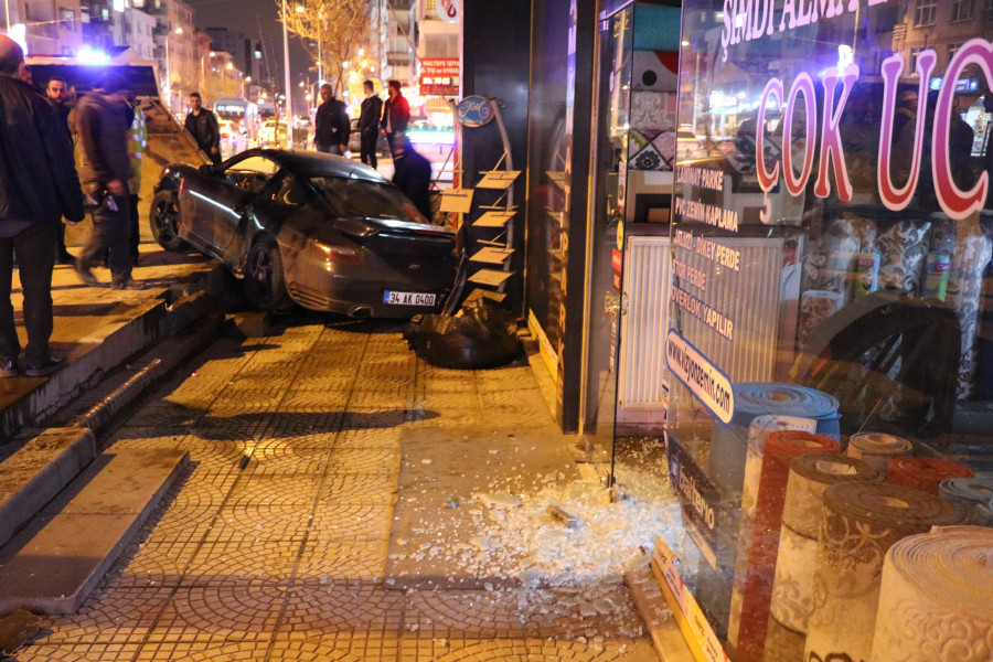 Sürücüsünün direksiyon hakimiyetini yitirdiği otomobil kaldırımdaki bariyerlere çarptıktan sonra halı satışı yapan bir iş yerine girerek durabildi. Kazada sürücü Turan K. ile otomobildeki arkadaşı yara almadan kurtuldu.