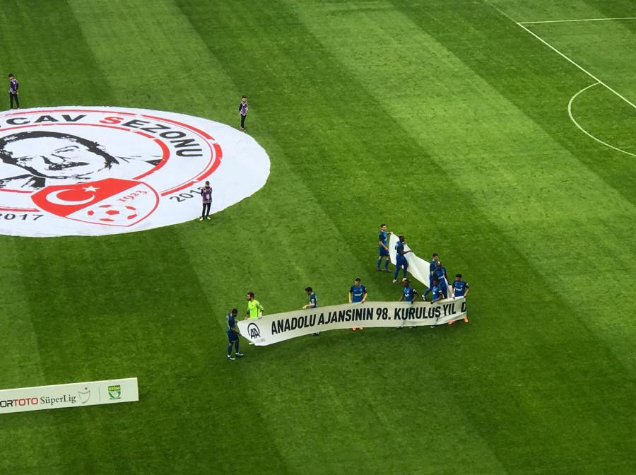 Bursaspor ve Kasımpaşa, maç öncesi ısınmak için sahaya, "Anadolu Ajansı'nın 98. kuruluş yıl dönümünü kutluyoruz" yazılı pankart ile çıktı.