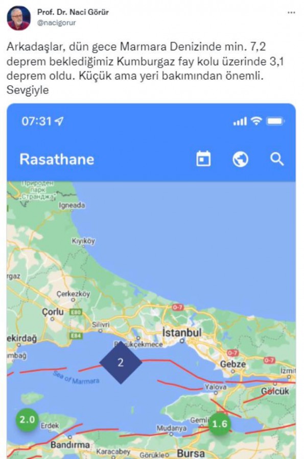 Bilim Akademisi üyesi ve Jeolog Prof. Dr. Naci Görür, "Arkadaşlar, dün gece Marmara Denizinde min. 7,2 deprem beklediğimiz Kumburgaz fay kolu üzerinde 3,1 deprem oldu. Küçük ama yeri bakımından önemli" değerlendirmesinde bulundu.