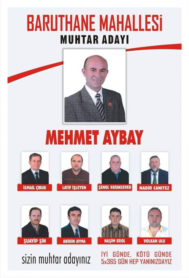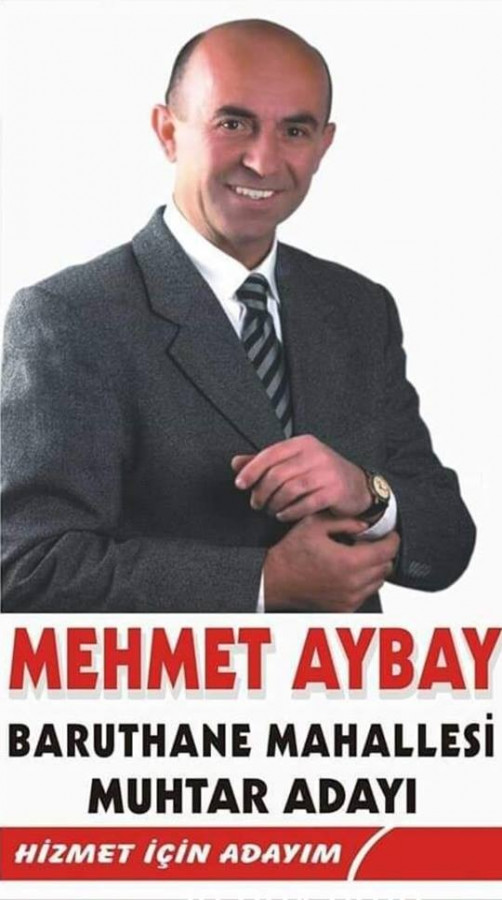 31 Mart'te yapılacak yerel seçimler öncesi Bursa'nın birçok mahallesinde muhtar adayları belli olmaya başladı. Yıldırım ilçesinin Baruthane Mahallesi'nde ise Mehmet Aybay adaylığını açıkladı. Aybay, "Bir gencin düşlerinde geleceği; bir yaşlının hatıralarında geçmişi görebilmeli! Çalışmadan başarmayı, sevmeden sevilmeyi, mutlu etmeden mutlu olmayı beklememeli. Hayaller gerçekleştirmek içindir. Hayallerim var, ancak sizin oylarınızla gerçekleşecek. Mahallemize renk getireceğim .Görmek ile bakmak arasında fark var ve bizimle farkı yaşayacaksınız" diyerek mahalle halkına seslendi. Mehmey Aybay'ın azaları ise İsmail Çibuk, Latif İşleyen, Şenol Vatansever, Nadir Canıtez, Şuayip Şin, Abidin Ayma, Haşim Erol ve Volkan Ulu oldu.