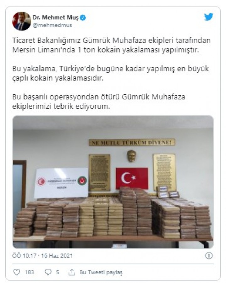 Ticaret Bakanlığı Gümrük Muhafaza ekipleri tarafından Mersin Limanı'nda 1 ton kokain ele geçirildi. Ticaret Bakanı Mehmet Muş, ''Bu yakalama, Türkiye'de bugüne kadar yapılmış en büyük çaplı kokain yakalamasıdır'' dedi.