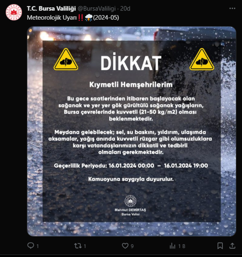 Meteoroloji Genel Müdürlüğü, Bursa'da kuvvetli sağanak yağış beklendiği duyurdu. Sarı kod ile yapılan uyarıda, "Yerel olarak kuvvetli (21-50 kg/m2) sağanak ve gök gürültülü sağanak yağış beklendiğinden sel, su baskını, yıldırım, ulaşımda aksamalar, yağış anında kuvvetli rüzgar gibi olumsuzluklara karşı dikkatli ve tedbirli olunması gerekmektedir. Başlama tarihi: 16 Ocak 00.00" ifadeleri yer aldı.