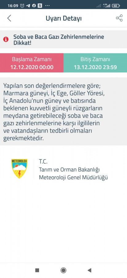 Meteoroloji Genel Müdürlüğü'nden yapılan açıklamada, "Yapılan son değerlendirmelere göre; Marmara güneyi, İç Ege, Göller Yöresi, İç Anadolu'nun güney ve batısında beklenen kuvvetli güneyli rüzgarların meydana getirebileceği soba ve baca gazı zehirlenmelerine karşı ilgililerin ve vatandaşların tedbirli olmaları gerekmektedir." denildi.