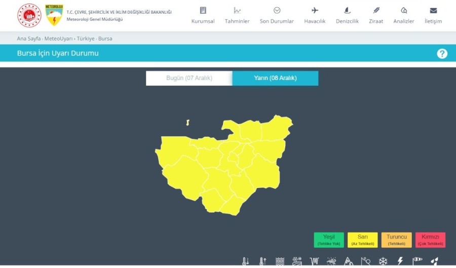 Meteoroloji Genel Müdürlüğü Bursa için sarı uyarıda bulundu.