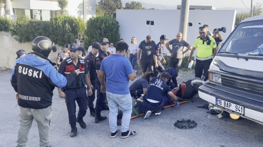 Bursa'da damacana su satıcısına ait minibüsün altında kalan motosiklet sürücüsü son anda ölümden döndü. Motosiklet minibüsün tekerleği altında kullanılmaz hale gelirken, 70 yaşındaki sürücü yaralı olarak kurtarıldı.