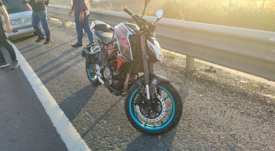 Savrulan motosiklet bariyerlere çarptı. Motosiklet üzerinde bulunan sürücü Hakan Y. ile arkasında yolcu olarak bulunan Hülya B. (35) bariyerlerin üzerinden yol kenarına savruldu. Motosiklet ise yolda bir süre başıboş gittikten sonra yol kenarına devrildi.