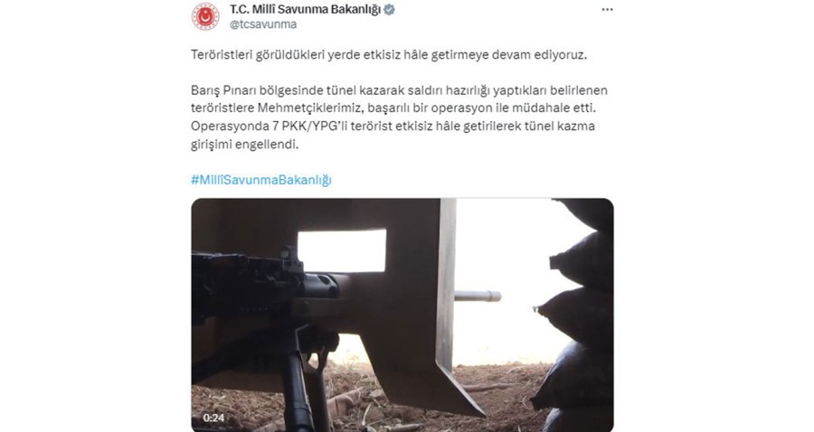 Milli Savunma Bakanlığı, sosyal medya hesabından yaptığı paylaşımda terör unsurlarının görüldükleri yerde etkisiz hale getirildiğini belirterek, "Barış Pınarı bölgesinde tünel kazarak saldırı hazırlığı yaptıkları belirlenen teröristlere Mehmetçiklerimiz, başarılı bir operasyon ile müdahale etti. Operasyonda 7 PKK/YPG'li terörist etkisiz hâle getirilerek tünel kazma girişimi engellendi" ifadelerine yer verdi.