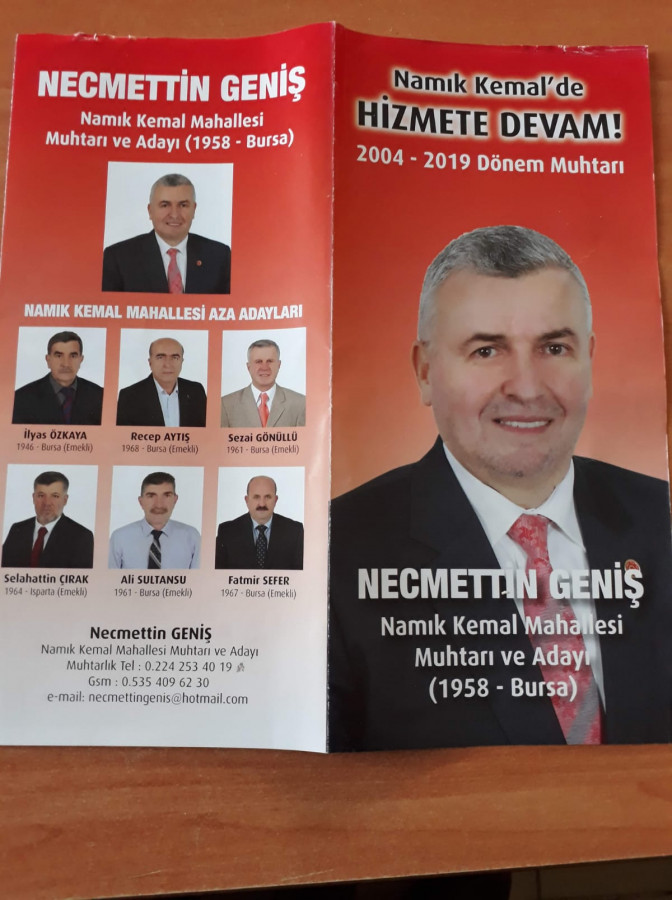 Bursa'da yerel seçim heyecanı her geçen gün artıyor. 31 Mart'ta yapılacak Belediye ve Muhtarlık seçimleri öncesi Bursa'da adaylar da çalışmalarını hızlandırdı. Osmangazi'de bulunan Namık Kemal Mahallesi'nde 2004'ten beri muhtarlık yapan Necmettin Geniş de çalışmalarını tüm hızıyla sürdürüyor. 15 senedir mahalleli tarafından çok sevilen Geniş, bu süreçte yaptığı tüm çalışmaları fotoğraflarla da anlatıyor.