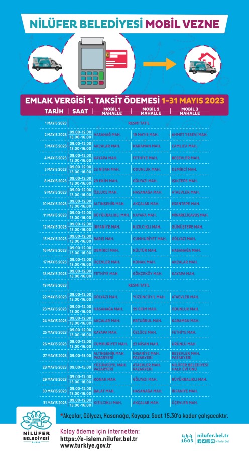 Gölyazı, Hasanağa, Akçalar ve Kayapa gibi şehir merkezine uzak mahallerde de vergi döneminde haftada bir gün bölgeye gidecek tahsildar ve veznedarlar, nakit veya kredi kartı ile ödemeleri tahsil edecek. İsteyen vatandaşlar, Nilüfer Belediyesi'nin www.e-islem.net internet adresi veya e-Devlet Kapısı üzerinden de vergi borcu sorgulama ve kredi kartıyla ödeme seçeneklerini kullanarak, vergilerini kolaylıkla internet aracılığıyla ödeyebilecekler.
