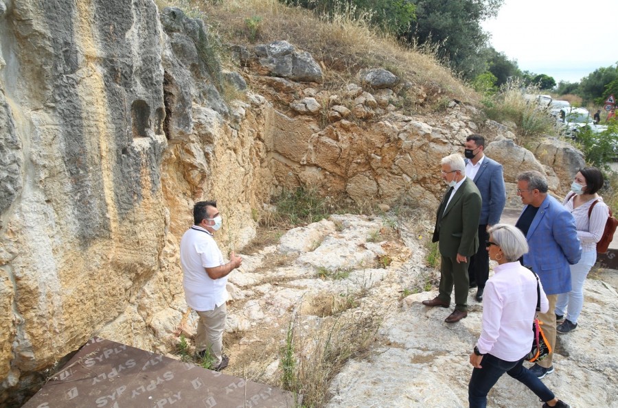 2015 yılından bu yana süren çalışmalar sonucu kurtarma kazıları, üst çatı koruma örtüsü ve açık hava müzesi düzenlemelerinin tamamlandığı Nekropol alanı incelemesinin ardından, antik tiyatro alanı, Demeter Kutsal Alanı ve Kız Ada'daki Apollon Tapınağı'nda incelemelerde bulunan Başkan Erdem, bu yıl kazıları sürdürecek Prof. Dr. Derya Şahin ve ekibine başarılar diledi.