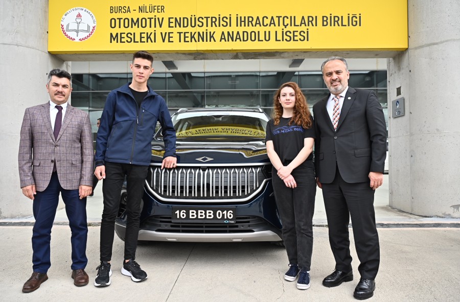 Bursa'nın Gemlik ilçesinde üretileceği gündeme geldiği ilk günden, aracın yollara çıktığı günümüze kadar kentte büyük heyecan uyandıran Türkiye'nin yerli ve milli gururu Togg, 16 BBB 016 plaka numarası ile Bursa Büyükşehir Belediyesi envanterine de girdi. Otomotiv sektörünün nitelikli iş gücü ihtiyacını karşılamak üzere Bursa'da kurulan Türkiye'nin ilk otomotiv lisesi, Otomotiv Endüstrisi İhracatçıları Birliği Mesleki ve Teknik Anadolu Lisesi'nde geçtiğimiz hafta düzenlenen festivale katılan Büyükşehir Belediye Başkanı Alinur Aktaş, Büyükşehir'e gelecek Togg'u ilk olarak bu okula getireceğine dair öğrencilere söz vermişti. Başkan Aktaş, dün gelen Togg ile birlikte ilk yolculuğunu da geleceğin otomotivcilerini yetiştiren bu okula yaptı. Öğrenciler tarafından okulun girişinde Türk Bayrakları ile karşılanan Togg, büyük heyecan uyandırdı.