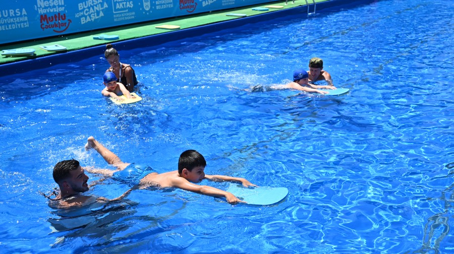 Bursa Büyükşehir Belediyesi, 'Neşeli Havuzlar Mutlu Çocuklar' projesi kapsamında kurulan portatif yüzme havuzları ile okul bahçelerini yüzme eğitim merkezlerine dönüştürdü. Çocukları eğitim aldıkları havuzda ziyaret eden Büyükşehir Belediye Başkanı Alinur Aktaş, "Çocuklarımızın neşesine şahit olmak büyük mutluluk" dedi.