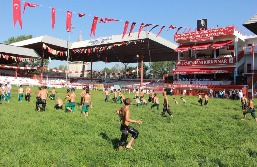 Edirne'de, Olimpiyatlardan sonra dünyanın en eski spor organizasyonu olan tarihi Kırkpınar'da, pehlivanlar dualı çayır Er Meydanı'na ayak bastı.