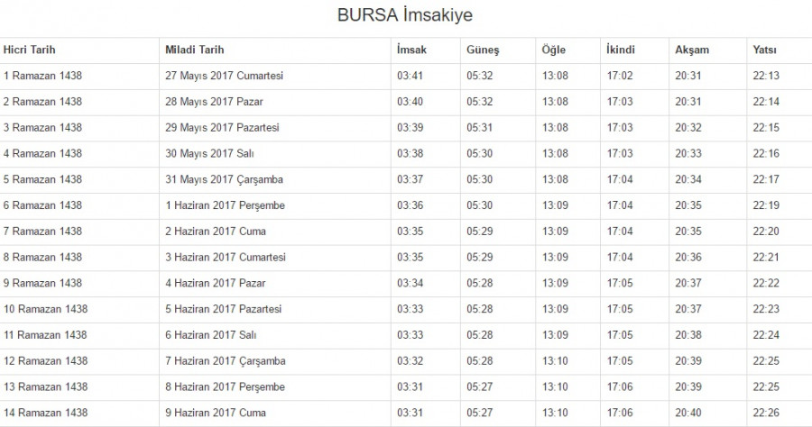 2017'nin ilk sahuruna saatler kaldı. Ramazan ayı, bu sene 27 Mayıs Cumartesi günü ( Cuma gününü Cumartesi gününe bağlayan gece ) başlayacak. Bursa'da ilk sahur 03.41'de bitmiş olacak. İlk oruç ise 20.31'de yapılacak iftarla açılacak. İlk teravih namazı bu akşam ( 26 Mayıs ) 22.23'de okucanacak yatsı namazını takiben kılınacak.