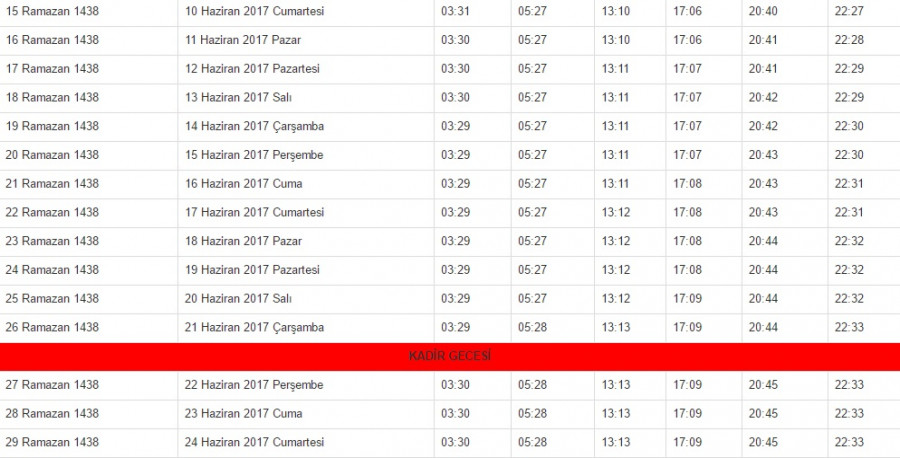 Ramazan ayı 24 Haziran 2017 günü (Arefe ) tutulan son oruçla biterken, 21 Haziran 2017 Çarşamba günü ise Kadir Gecesi olacak.