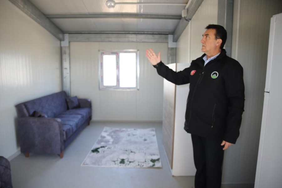Osmangazi Belediye Başkanı Dündar konteyner kent kurduklarını belirterek, "Yine Gaziantep'te İslahiye'de temizlik, aşevi ve bununla birlikte çok önemli bir proje burada bizden istenilen 15 bin metrekare alan üzerine bir mahalle kuruyoruz. 100 hanelik bir mahalle kuruyoruz. Bu mahalle içerisinde cami, okul, oyun parkı, millet kıraathanesi ve 6 bilgisayarında içerisinde olan bir bilgisayar sınıfı oluşturuyoruz. Bununla birlikte alt yapı çalışmaları trafo, kanalizasyon, pis su temiz su giderlerinin hepsinin belediyemiz tarafından yapılıyor. Bu mahallemizde wifi uydu antenleri her şey mevcut, bununla birlikte burayı bayramdan sonra teslim etmeyi planlıyoruz. İçerisine girdiğimizde lavabo, mutfak, salon, banyosu, tuvaleti ve bunun yanında buzdolabı, çamaşır makinası ve koltukları olan hazır oturmaya ayarlanmış bir daire içerisinde buradaki insanlarımızı karşılamış olacağız. Tabi teslime edilirken hazır gıda ve hijyen paketleriyle beraber bir daire insanlarımıza sunmuş olacağız. Burada ciddi bir travma yaşandı. Akşam zengin yattık sabah fakir kalktık, akşam tok yattık sabah aç kalktık. Dolayısıyla bu travmayı aşmamız lazım. O eski günlere dönmemiz gerekiyor. Onun için bizlerde burada hiçbir şeyi tüm ince detaylara girerek burada güzel bir mahalle kurduk. Burası özel projelendirildi ve prefabrik bir yapı, dolayısıyla her şeyiyle konforlu yaşanılabilir inşallah buraya gelindiğinde de o eski günlerde vatandaşlarımızın mutlu huzurlu günleri yakalayacağı bir mahalle olur. Tekrardan tüm Türkiye'ye ve bu bölgenin insanına geçmiş olsun diliyorum. Burası ilk etapta 100 ailelik bir yapı, bunların üretimi özel üretimdir. Zaten birçok yerde AFAD tüm firmalara müdahale edip kendine çalıştırıyor. Bizlerde bu çalışmaları özel firmalarda yaptırarak montajını sıkı bir şekilde takip ediyoruz. Bunları bitirmeye çalışıyoruz. 100 hanenin bir an önce buraya yerleşmesi için çalışıyoruz" diye konuştu.