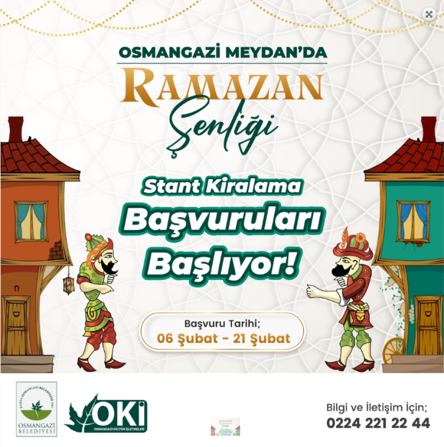 Her akşam birbirinden eğlenceli etkinliklerin yer alacağı Ramazan Şenliği'nde kurulacak olan stantlar için kiralama başvuruları başladı. Başvurular 21 Şubat gününe kadar devam edecek. Ramazan Şenliği'nde yer almak isteyenler 0224 221 22 44 numaralı telefondan detaylı bilgi alabilirler.