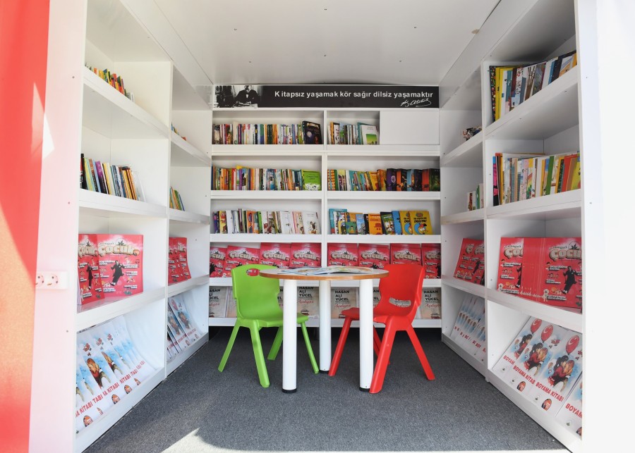 Konuşmaların ardından Gezici Kütüphane'nin içerisine giren Başkan Aydın, kütüphanenin raflarından seçtiği kitabı, törene katılan bir çocuğa verdi.