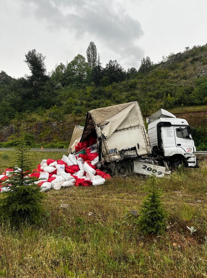 Kaza, saat 16.00 sıralarında İnegöl-Yenişehir yolu üzerinde meydana geldi. İnegöl'den Yenişehir'e seyir halinde olan Mehmet A. (46) yönetimindeki 47 PD 135 plakalı gıda ürünleri yüklü tırın dorsesi virajda kontrolden çıkarak kaymaya başladı.