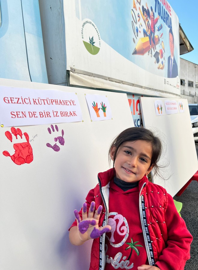 Osmangazi Belediyesi'nin merkeze uzak mahallerdeki çocukları kitap ile buluşturmak ve onlara okuma alışkanlığı kazandırmak amacıyla hayata geçirdiği Gezici Kütüphane'ye gelen küçük öğrenciler, rengarenk boyadıkları elleri ile hatıra panosu oluşturdu.