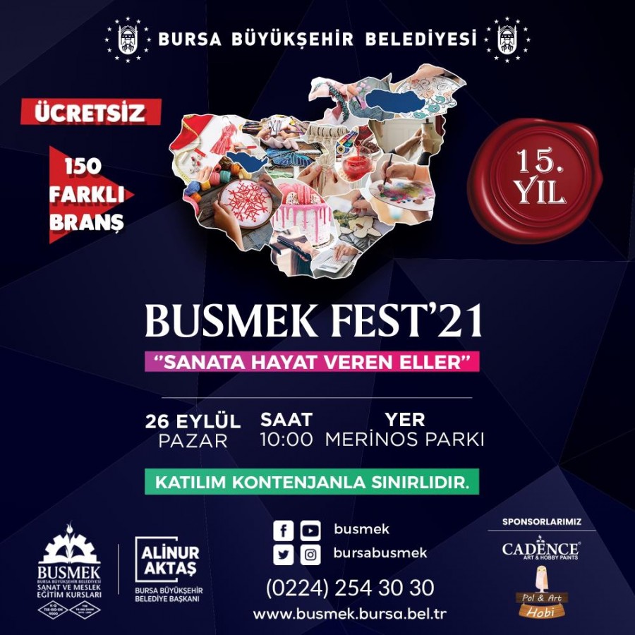 Öte yandan BUSMEK, 15. yılına özel olarak Türkiye'nin en büyük atölye çalışmasını yapmaya hazırlanıyor. "Sanata Hayat Veren Eller" temasıyla hazırlanan BUSMEK FEST'21 festivali, 26 Eylül Pazar günü saat 10.00'da Merinos Parkı'nda düzenlenecek. Festivalde birbirinden farklı 150 branş yer alırken, atölye çalışmaları ücretsiz yapılacak. Atölye çalışmalarına katılmak için BUSMEK web sitesinden online başvuru yapılabilirken, Merinos Kurs Merkezi'ndeki branşlardan (workshop) bir seçilebiliyor. Vatandaşlar, en fazla 2 farklı atölye çalışmasına katılabilecek. Ayrıca ikinci bir branşa katılmak isteyenler en yakın kurs merkezimize giderek başvuru yapabilir.