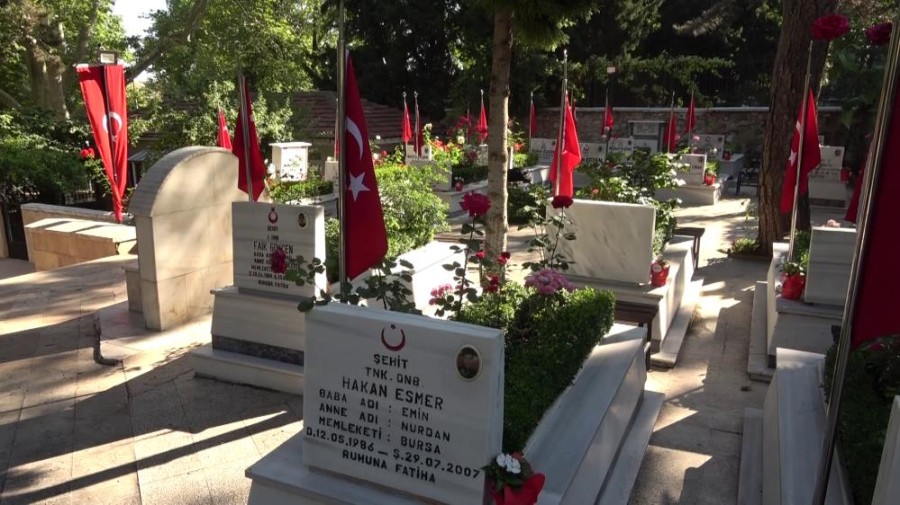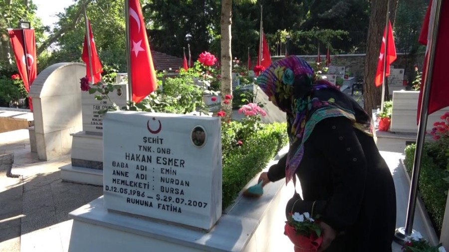 Bursa'da Kurban Bayramı dolayısıyla şehit yakınları kabir ziyaretlerinde bulundu. Mezardaki otları temizleyerek şehitlerine dua eden aileler kimi zaman gözyaşlarına hakim olamadı. 2007 yılında oğlu Kıbrıs'ta şehit düşen 57 yaşındaki anne Nurcan Esmer oğlunun başında dua ederek mezarını temizledi.