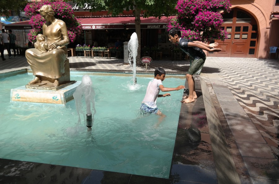 Güneşin tepede olduğu öğle saatlerinde birkaç çocuk sıcak havadan bunalınca, Taşbaşı Meydanı'nda bulunan bir süs havuzunda yüzerken görüntülendi.