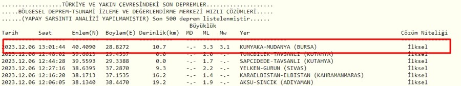 Kandilli Rasathanesi verilerine göre, saat 13:01'de Bursa'nın Mudanya ilçesinde 3.1 büyüklüğünde deprem meydana geldi.