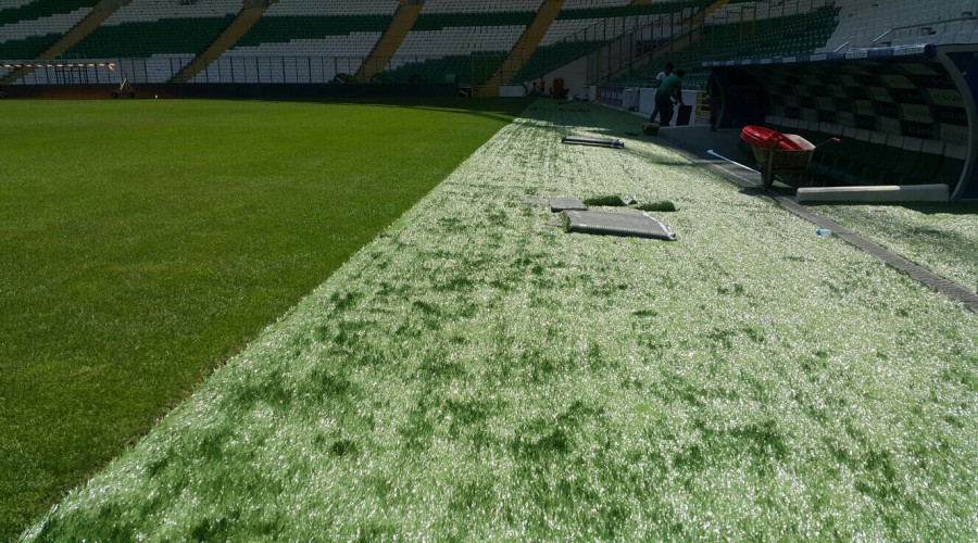 Saha zeminine yeni serilen çimin oturduğu ve hibrit çim dikimine hazır olduğu belirtildi. Saha kenarında futbolcuların ısınacağı bölümde ise UEFA standartlarına göre suni çim döşemesi yapılırken Teksas kale arkası tarafında ise suni güneş ışığı sağlaması yapılıyor.