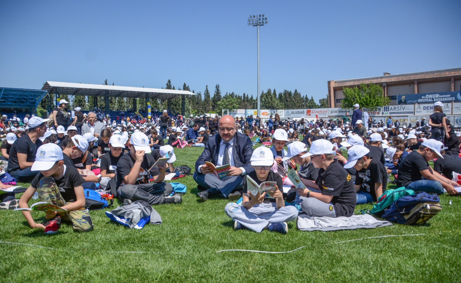 Karacabey Belediye Başkanı Ali Özkan, 10 bin öğrenciyle birlikte ilçe stadyumunda kitap okudu.