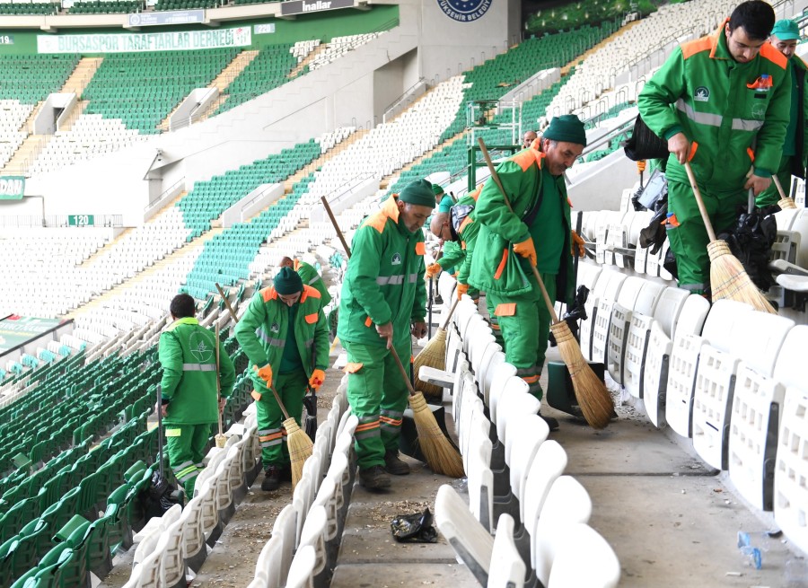 Osmangazi Belediyesi Temizlik İşleri Müdürlüğü ekipleri, bu hafta oynanan ve Bursaspor'un 2-0 kazandığı Ergene Velimeşespor karşılaşmasının ardından temizlik çalışması gerçekleştirdi. Stadyum çevresinde, koridorlarda ve tribünlerde iki gün boyunca temizlik çalışması yürüten ekipler, 43 bin 361 kişi kapasiteli dev stadyumu baştan aşağı temizleyerek bir sonraki karşılaşma için hazır hale getirdi.