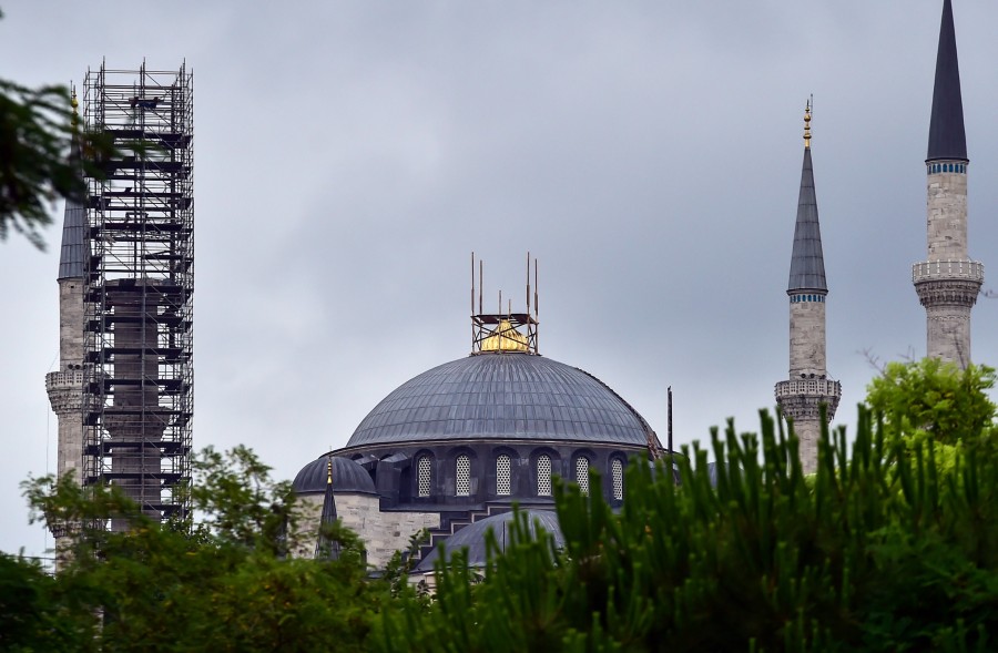 Mimar Sinan'ın öğrencisi Sedefkar Mehmet Ağa'nın eseri 400 yıllık Sultanahmet Cami'nin sökülen dev kubbe alemi yerleştiriliyor. İşçilerin 43 metre yükseklikteki ana kubbe üzerinde çalışması havadan görüntülendi.